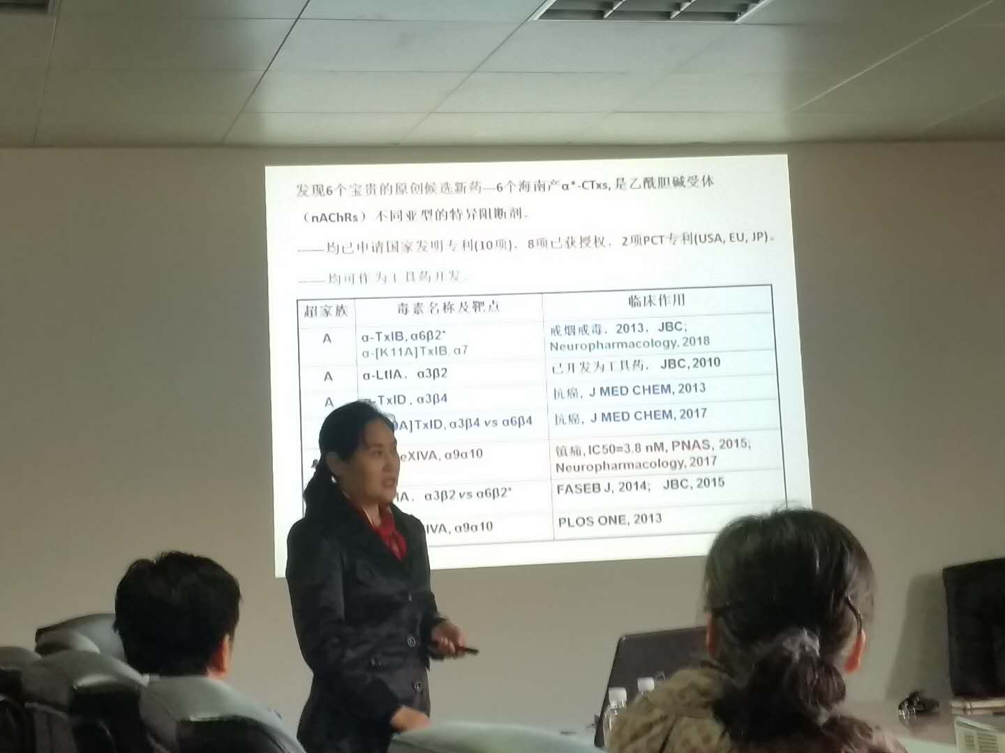 罗教授作了题目为“α*-芋螺毒素及其受体”的学术报告,介绍了作用于烟碱型乙酰胆碱受体不同亚型的、海南产新型α家族芋螺毒素的结构与功能,以及它们在治疗神经痛、成瘾、癌症等的新药研发领域的开发前景。他们已经筛选鉴定出6个作用靶点清楚的原创候选新药,它们在神经痛、戒烟戒毒、小细胞肺癌等的新药研发领域,具有极好的开发前景。