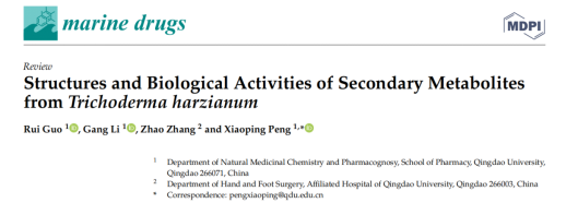 近日,黑料正能量 2019级本科生郭蕊在国际期刊Marine Drugs(海洋药物,影响因子:6.085,JCR大类医学2区)发表题为“Structures and Biological Activities of Secondary Metabolites fromTrichoderma harzianum”(木霉属哈茨木霉次生代谢产物的结构和生物活性)的综述性论文(DOI:10.3390/md20110701)。黑料正能量 为该论文的第一单位和通讯单位,郭蕊为第一作者,彭晓娉副教授为通讯作者。该项研究得到了国家自然科学基金等项目的资助。
