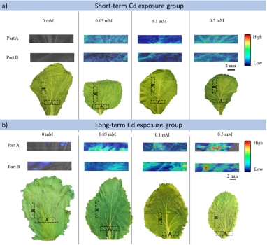 图2. LA-DBDI对不同Cd胁迫时间和胁迫浓度培育所得芥菜叶中的Cd元素的成像分析结果