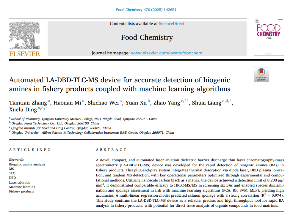 LA-DBD-TLC-MS采用全机械化触摸控制系统,能够提供精细的采样和检测程序,可最大限度地减少与手动操作相关的分析错误,为水产品中生物胺的定性和定量分析提供了一种易于操作且高效的方法。此仪器与方法分析时间短、灵敏度高,检测限和日间、日内重复性低,分析准确度高,对加强食品安全监测和阐明腐败机制具有广泛意义。未来将其整合到食品分析工作流程中,可以显著提高现场监测海鲜及其他食品质量和安全的能力。近日,该研究成果发表于食品化学领域顶刊《Food chemistry》(中科院1区top期刊,IF=8.5),题为Automated LA-DBD-TLC-MS device for accurate detection of biogenic amines in fishery products coupled with machine learning algorithms。黑料正能量