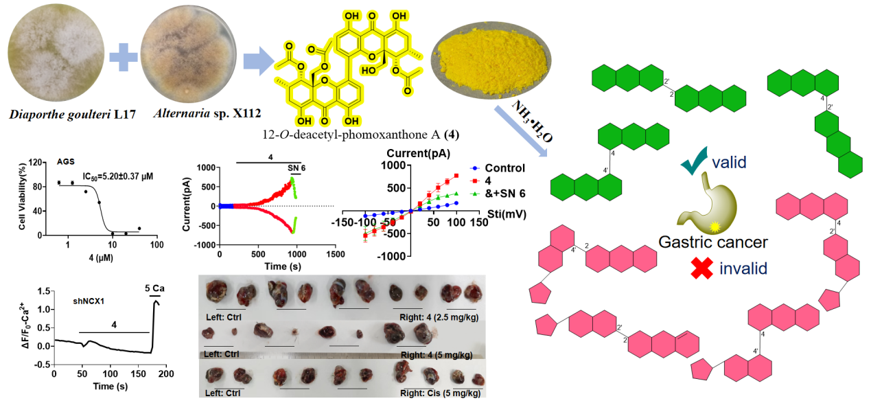 董辉教授与彭晓娉副教授联合团队在微生物源天然产物抗胃癌机制研究领域取得重要突破。其研究成果“Fungal dimeric xanthones as anticancer agents by novelly stimulating sodium-calcium exchanger 1”(DOI:10.1016/j.ejmech.2025.117543)发表于药物化学领域的经典顶级期刊《European Journal of Medicinal Chemistry》(中科院医学2区,药物化学1区,IF = 6.0)。该研究由硕士研究生周国龙、董克敏共同完成,董辉教授和彭晓娉副教授为共同通讯作者。