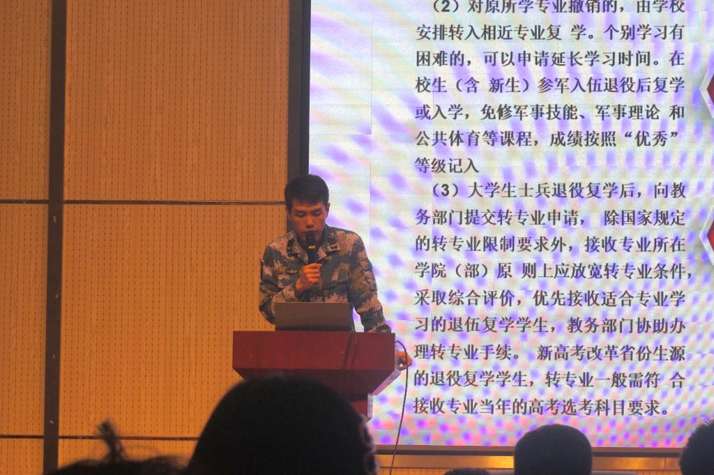 接下来,郁一帆从部队简介、应征入伍基本条件和入伍流程三个方面系统全面地向大家介绍了入伍基本概况,并对大学生参军特别优惠政策进行了详细的解读。最后,他号召同学们要珍惜携笔从戎的机会,把握机遇,切实把参军入伍当作锻炼自己、提升自己的大舞台,让青春在军营的历练中、在保家卫国的奉献中闪光!