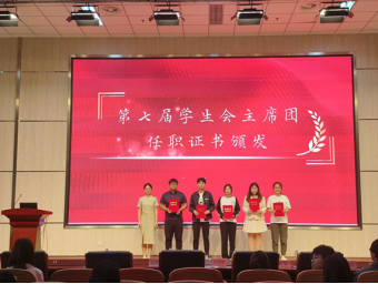 学生会主席杜晓通、分管主席姜婷钰、邢春晓、赵俊洁、新媒体中心主任王天屹、秘书长臧瑜分别上台致辞,总结汇报了过去一年的工作内容,他们激励各学生会成员在新的一年中戒骄戒躁,不忘初心,做老师和同学之间沟通的桥梁,继续努力为学校、学院、同学服务。仇启荣老师为各位主席团成员颁发任职证书。