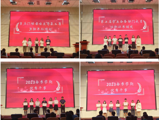 随后,学生会全体成员上台领取任职证书。主持人宣布本学期学生会优秀副部及优秀干事名单并进行颁奖。共有12位同学获得“优秀副部”称号、22位同学获得“优秀干事”称号,学生会主席团成员分别为获奖者颁发荣誉证书并合影留念。
