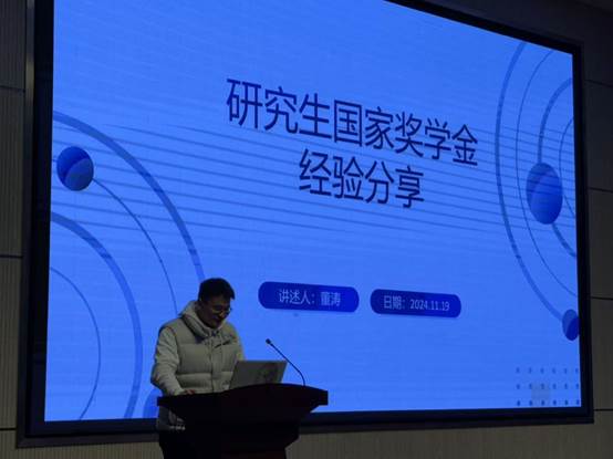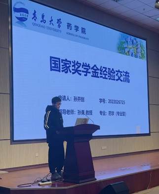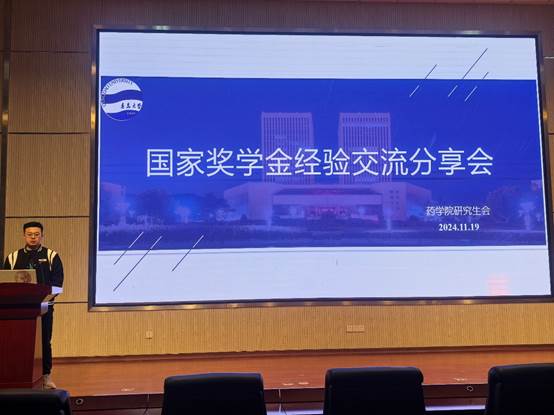 研究生国家奖学金经验交流分享会。本次活动邀请了2024年研究生国家奖学金获得者2021级药学博士研究生董涛、2022级药学硕士研究生孙开创、2022级药理学硕士研究生荣绍亚,以及2023级天然药物化学硕士研究生彭笛进行经验分享。会议由研究生会蒋沁希同学主持,2023级、2024级研究生参会。
