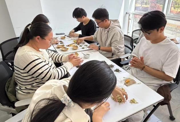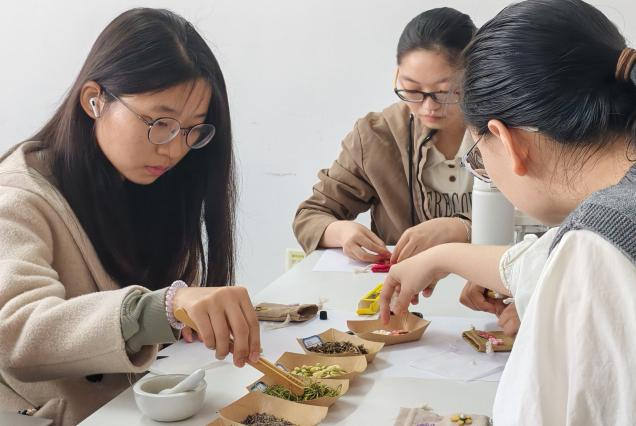 “古人以草木为药,以香草为佩,驱虫避秽,安养身心……”通过工作人员的讲解,同学们系统学习了香囊从先秦至唐宋的历史演变,深入了解艾草、薄荷、丁香等药材的性味归经与驱蚊药理,不仅丰富了中医药知识,更深刻体会到香囊承载的民俗内涵与文化价值。