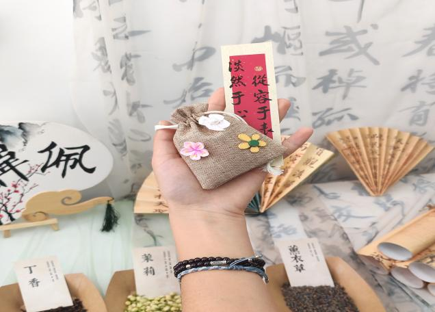 活动现场设置了古风打卡台,参与者完成作品后携香囊拍照留念,挑选如意扇、书签等道具,定格传统文化与现代生活交融的独特瞬间。