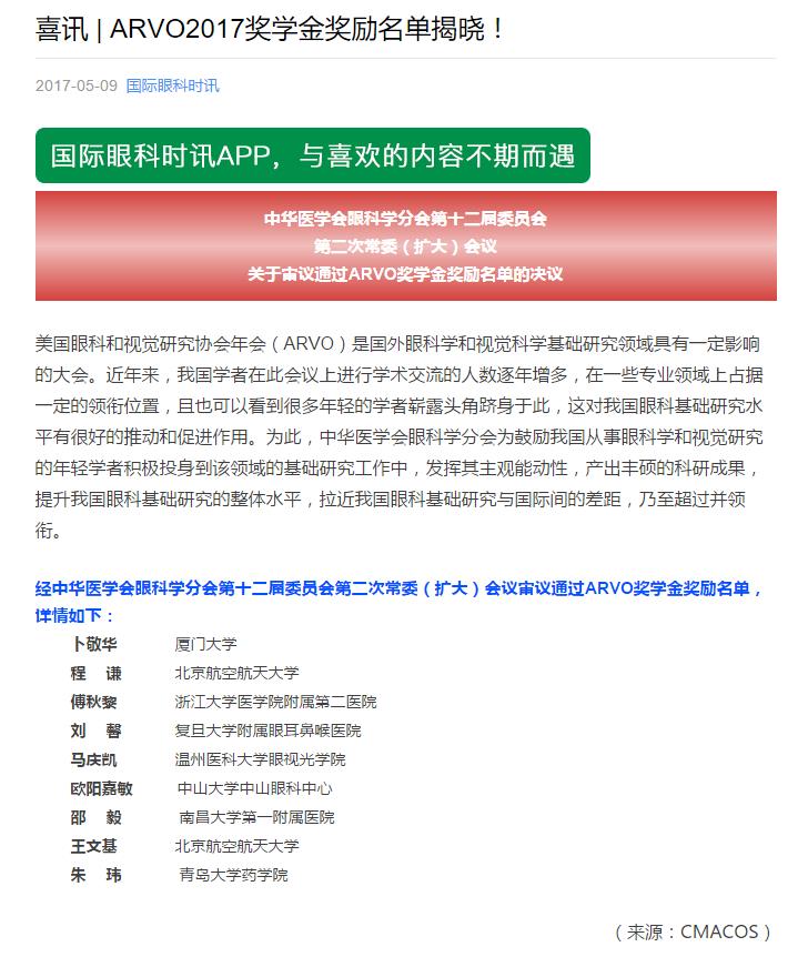 2017年5月9日,经中华医学会眼科学分会第十二届委员会第二次常委(扩大)会议审议通过美国眼科和视觉研究协会年会(ARVO)奖学金奖励名单,黑料正能量