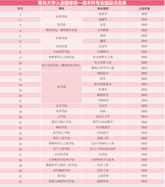 2020年度全校14个本科专业入选国家级一流本科专业建设点,2个本科专业入选山东省一流本科专业建设点。至今,全校共有32个专业获批国家级一流本科专业建设点,4个专业获批省级一流本科专业建设点。