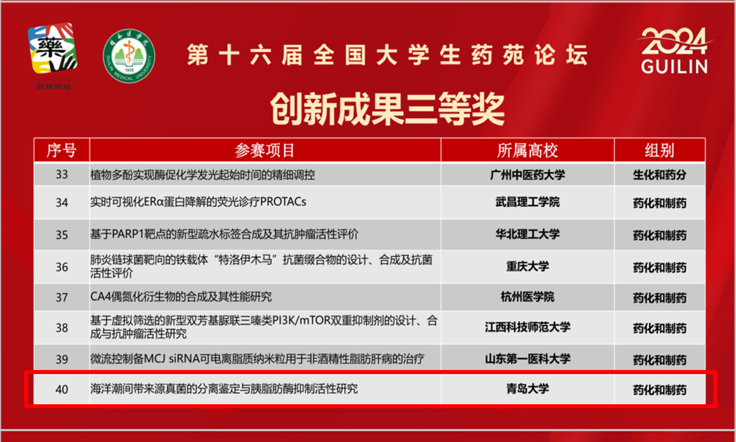 高度重视,从药学领域的各项研究项目中遴选出具有创新性和实践价值的课题,进行细致培育和合理孵化。由曹洁教授指导的2022级药学专业本科生王艺霖负责的项目《补氧型温敏脂质体用于细菌性关节炎的光动力学研究》获药学科学赛道创新成果二等奖。由孙世伟副教授指导的2021级药学专业本科生孙雨萌负责的项目《海洋潮间带来源真菌的分离鉴定与胰脂肪酶抑制活性研究》获药学科学赛道创新成果三等奖。