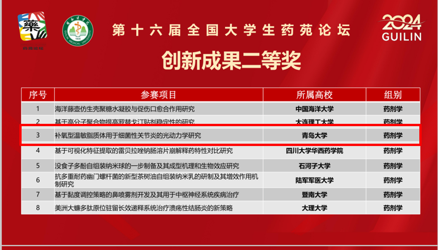 “药苑论坛”是全国高等教育药学类顶级赛事。本次论坛汇聚了全国药学领域的知名专家学者,来自北京大学、复旦大学、四川大学、中国药科大学等124所高校近600名师生线上线下参加,参赛高校和参赛作品数量均创历年新高。本次论坛设立“药学科学”和“药学服务”两个赛道,共收到论文作品296篇、壁报作品286项,创新成果评选作品251项。经过激烈角逐,共评出创新成果特等奖3项,一等奖16项,二等奖51项,三等奖74项。