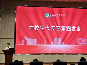 新生代表、2025级本科生刘子旋分享了自己与药学相遇的初心,表示将始终恪守“明德、博学、守正、出奇”的校训精神,向前辈和师长看齐,在求知路上笃实前行,努力成长为专业功底扎实、综合素养全面的新时代合格大学生。