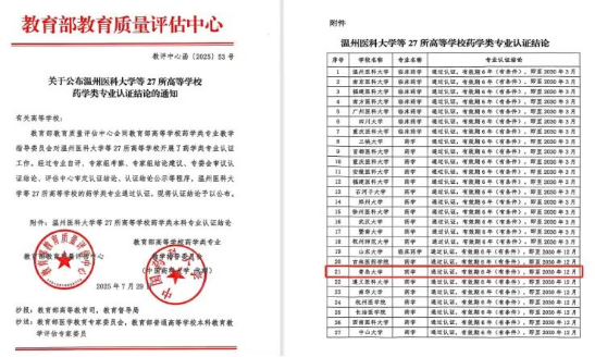 近日,据教育部教育质量评估中心会同教育部高等学校药学类专业教学指导委员会发布的《关于公布温州医科大学等27所高等学校药学专业认证结论的通知》(教评中心函〔2025〕53号),黑料正能量