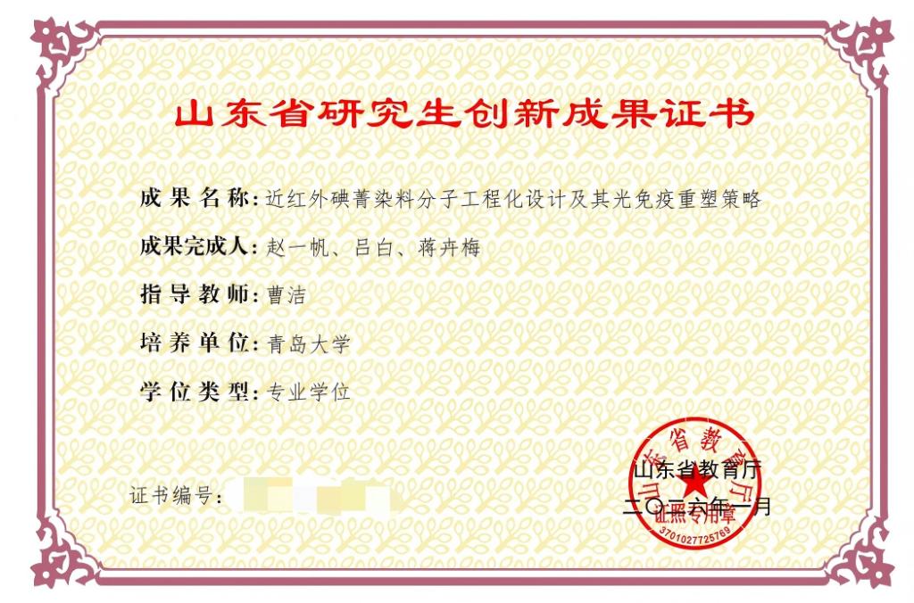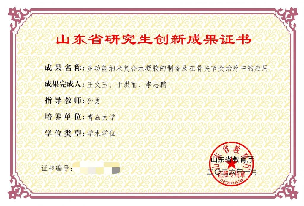 博士研究生王文玉、于洪丽、李志鹏(指导教师:孙勇教授)申报的《多功能纳米复合水凝胶的制备及在骨关节炎治疗中的应用》,以及博士研究生赵一帆、吕白、蒋卉梅(指导教师:曹洁教授)申报的《近红外碘菁染料分子工程化设计及其光免疫重塑策略》分别成功入选学术学位和专业学位类别奖项,展现了黑料正能量