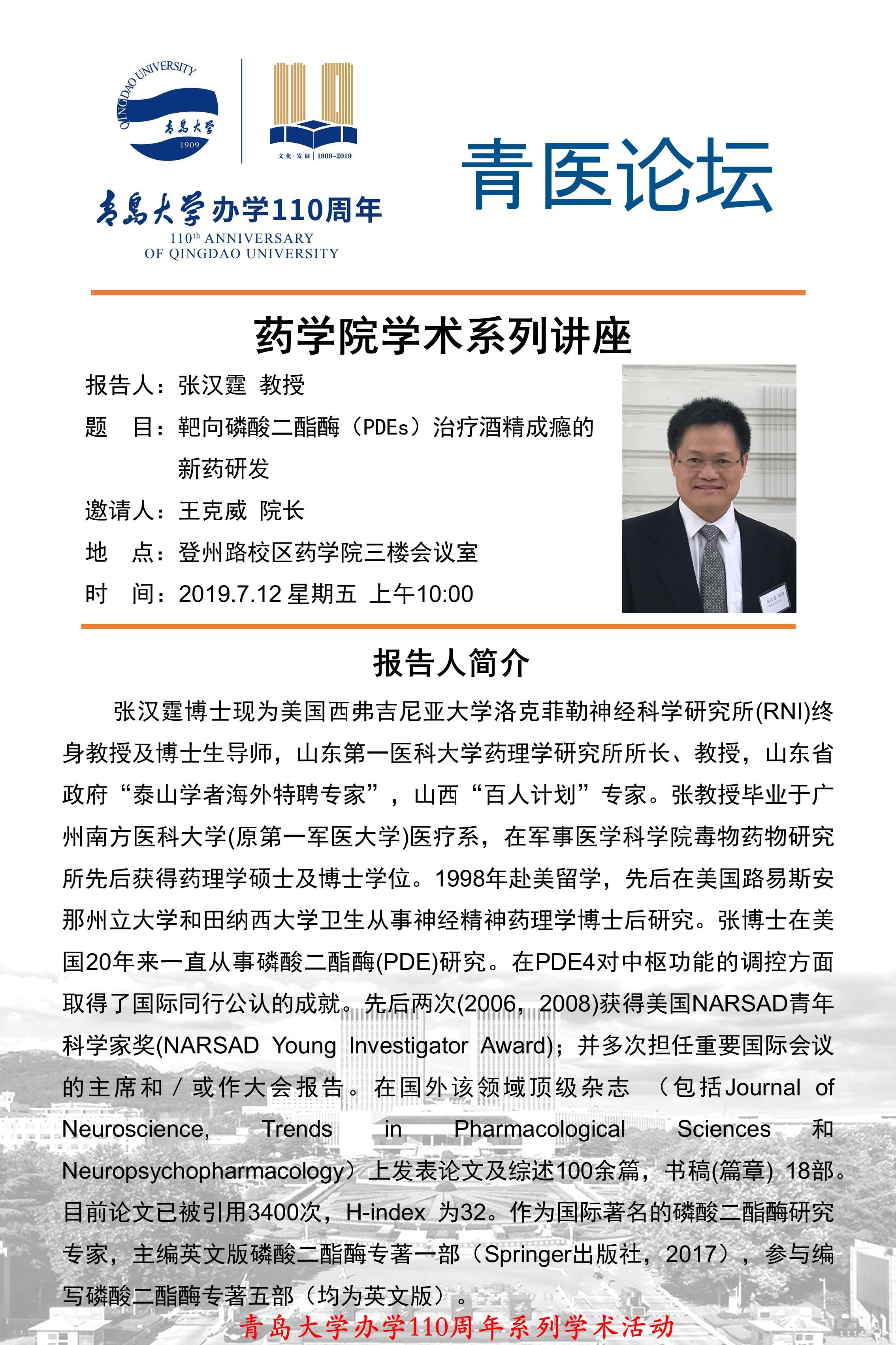 黑料正能量 学术系列讲座预告--张汉霆 教授