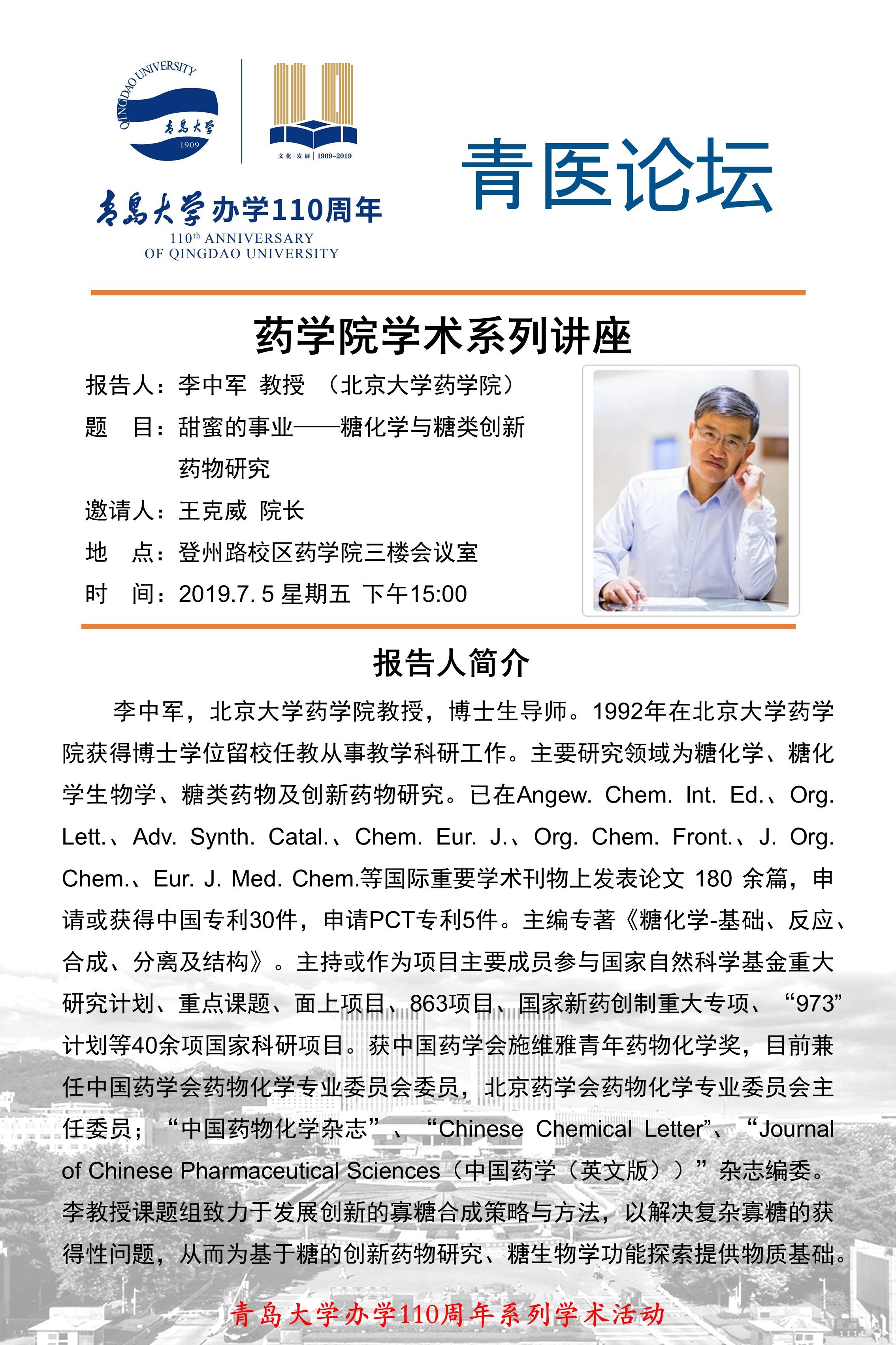 黑料正能量 学术系列讲座预告--李中军 教授
