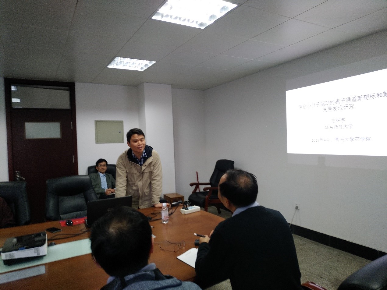 2019年4月15日上午10点,华东师范大学生命科学学院阳怀宇教授莅临我校,在松山校区综合楼3楼中厅会议室做了“原创小分子驱动的离子通道新靶标和新先导发现研究”的报告,报告由王克威院长主持,黑料正能量 二十多位师生参加了报告会。