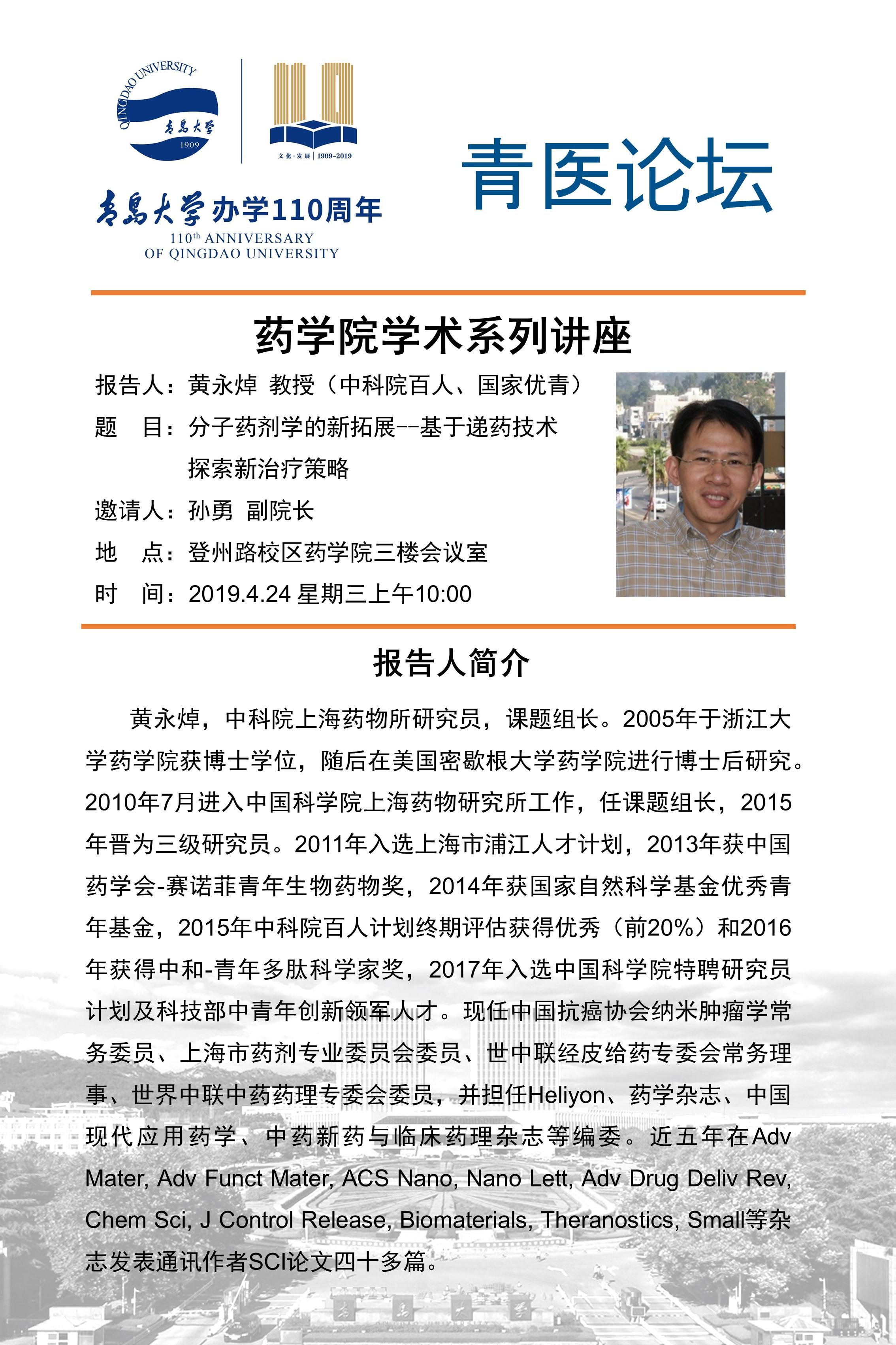 黑料正能量 学术系列讲座预告--黄永焯 教授