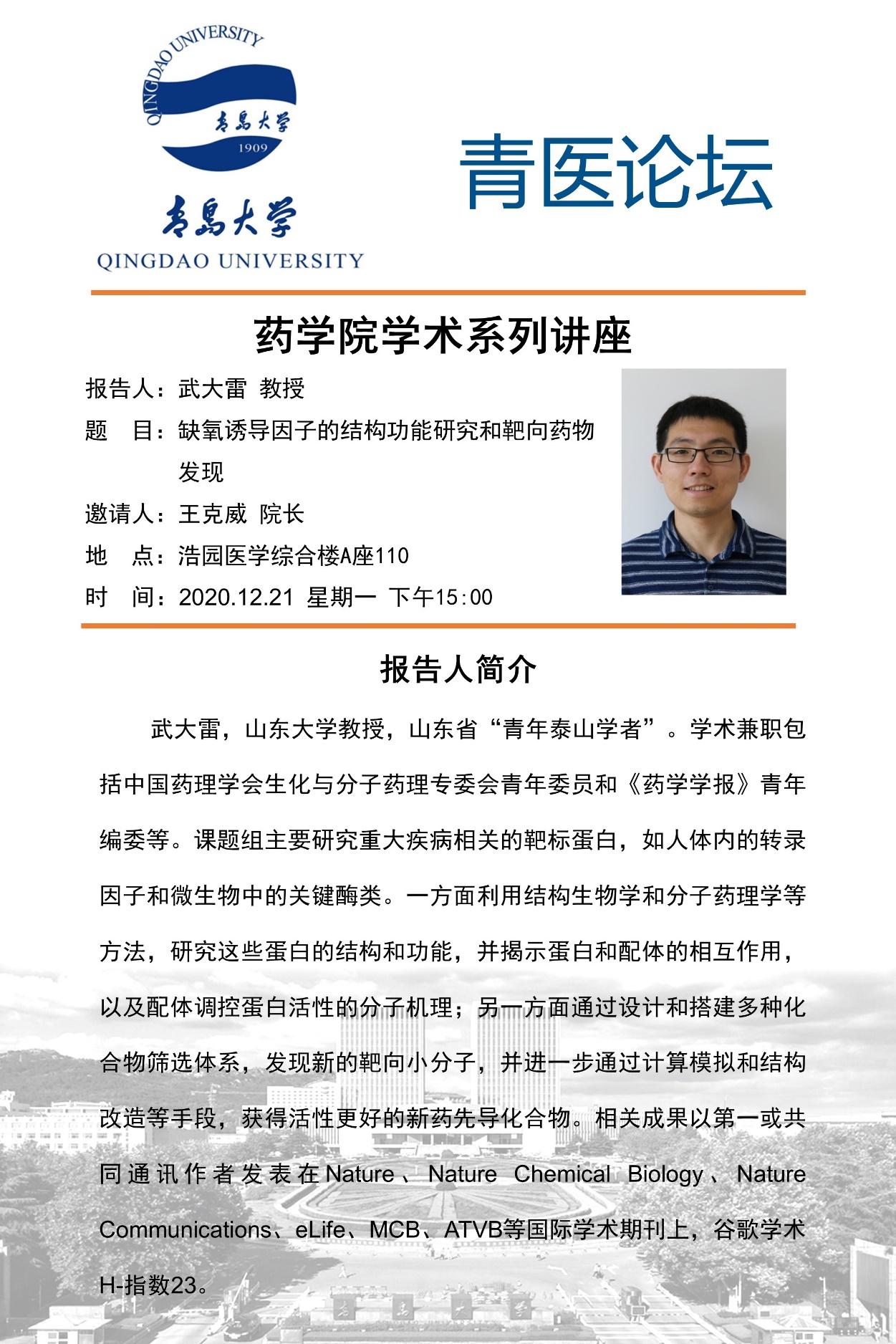 邀请山东大学武大雷教授作了题为《缺氧诱导因子的结构功能研究和靶向药物发现》的学术报告,报告在浩园医学综合楼A座110会议室举行,会议由王克威院长主持。