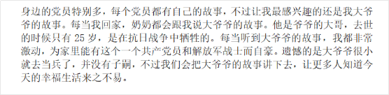听一个党员故事。聆听党员故事,传承红色精神。同学们通过线上线下相结合的方式,亲身走访老党员同志或者是在线上听取老党员同志的讲述,经历了别开生面的精神洗礼。听他们讲述着自己在人生过程中对党愈发深厚的理解,诉说着中国共产党百年来遭受的千万磨难,无不显示着老党员同志对党和国家的无限赤诚,同学们纷纷响应、心潮澎湃。
