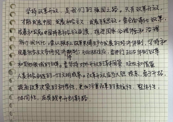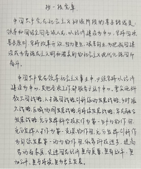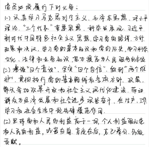 抄录一段党章。党章是党建设的强有力的武器,抄写党章是很好的学习形式。党员同志们在抄党章的过程中,用党章和入党誓词警醒约束自己,坚定自身理想信念。手抄一遍党章,也是重新学习一次党章,联系思想、工作和生活实际,在学中思、思而践,践后悟的思考过程,有助于不断提高同志们的履职能力,坚守责任担当。