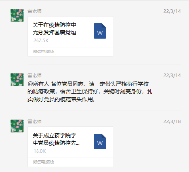 学生党员疫情防控先锋队,确保信息上传下达迅速畅通。 安排学生党员联系上报自己负责的班级、同学的核酸检测工作和校外实习学生的安全情况,要求支部党员做到“两个必须”:一是必须主动发挥模范带头作用,做到有安排必遵守;二是必须主动参加力所能及的校内防疫志愿者服务,做到有要求必回应”。充分发挥党组织战斗堡垒作用和党员先锋模范作用。