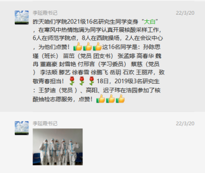 疫情防控期间,留校值守的学院领导、辅导员、研究生导师,每天巡查实验室、宿舍最新情况,及时关注和解决学生的问题和诉求,高质量完成“一日三检”、信息上报、线上课堂访查、夜间考勤登记、落实每日20%学生核酸抽检等工作,严格落实疫情防控政策,确保同学们学习生活秩序高效、有序运转。学院全体学生党员,75名入党积极分子、学生干部、学生,纷纷加入到学校“疫情防控志愿服务队”中,从事学校、学院疫情防控志愿服务工作。大家身穿志愿者马甲,每天准时到达值班岗位,维护好同学们上学时段和餐厅打饭的秩序,提醒师生保持安全距离并监督大家带好口罩,不取快递,不订外卖。为全体师生的身体健康和生命安全筑牢防线。